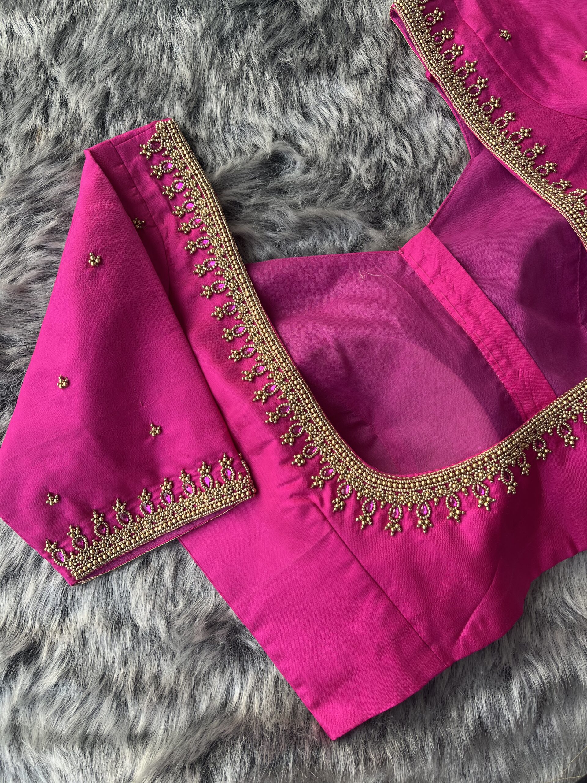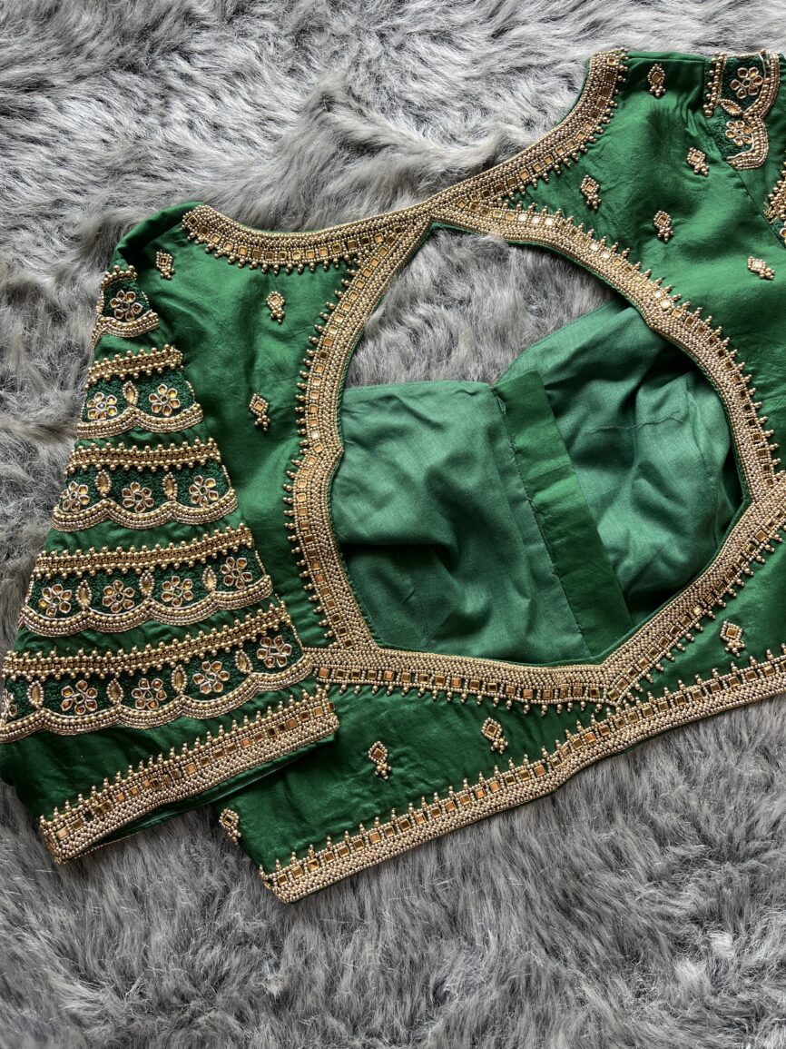 Crafted in rich silk, this blouse reflects the opulence of traditional Indian embroidery. The teardrop motifs and intricate bead border highlight expert craftsmanship, creating a regal look for any occasion. The perfect use of gold moti along with Kundan adds Richness and Heaviness to its Design.