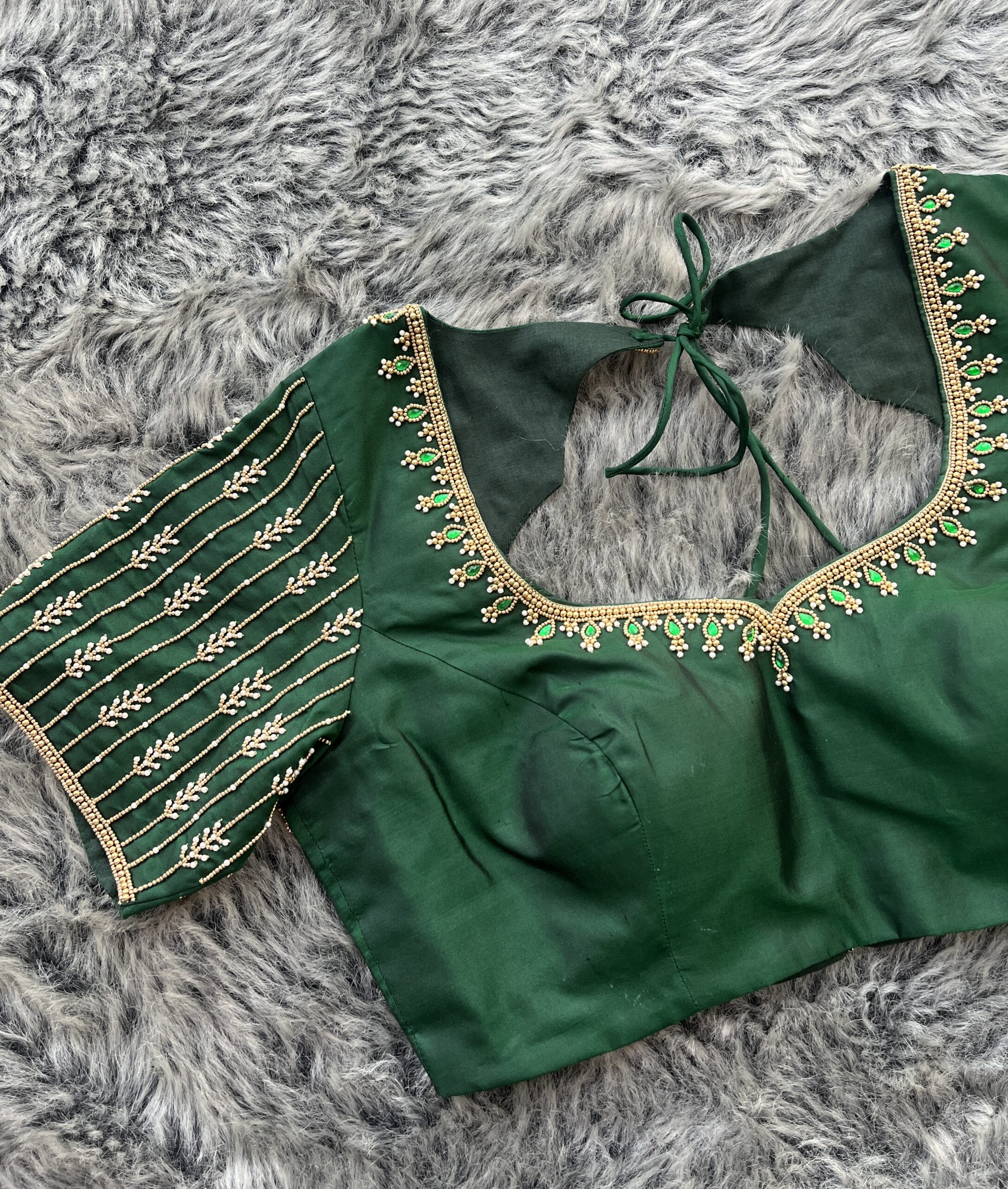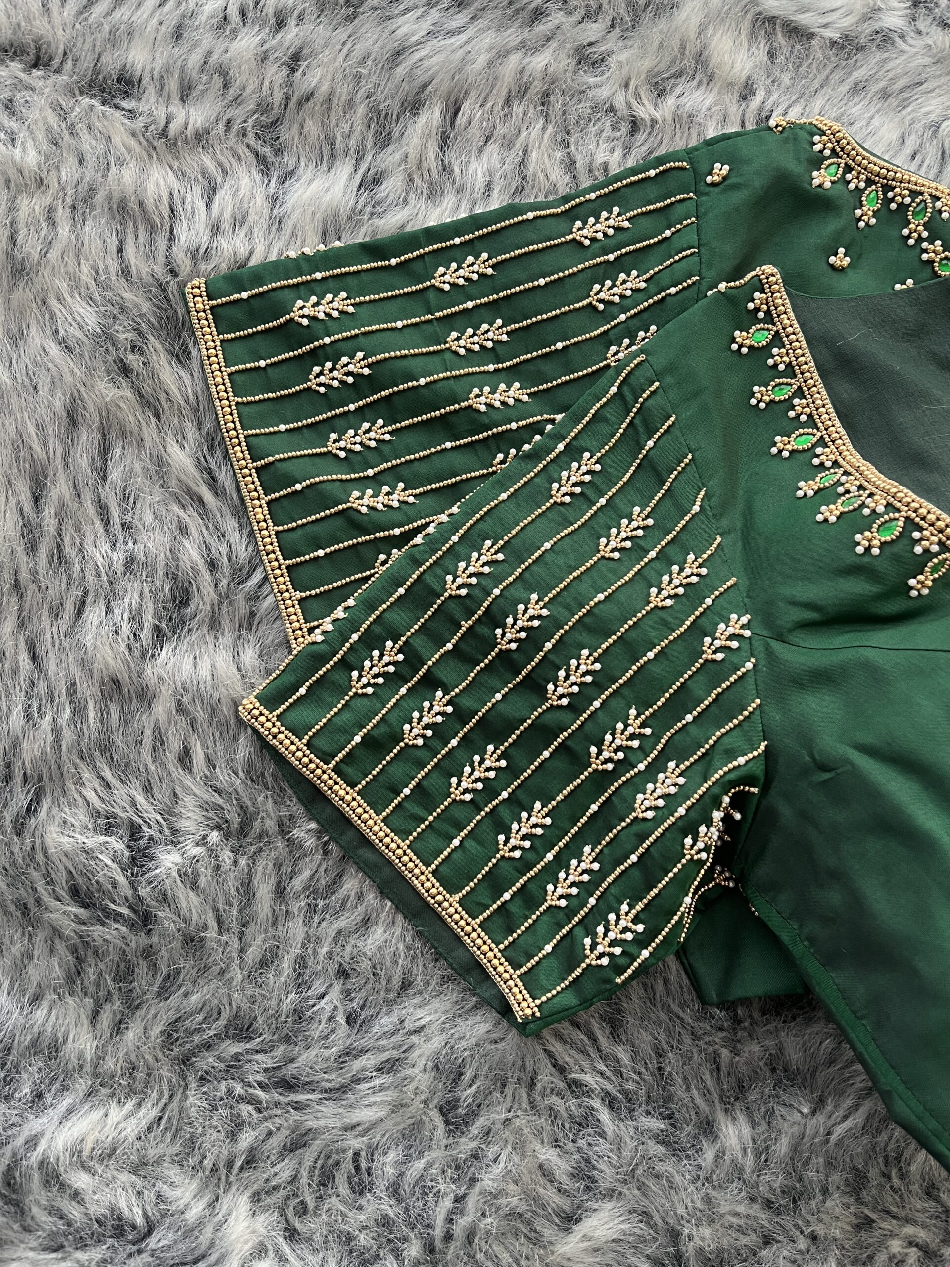 The rich green fabric combined with delicate gold embroidery creates a timeless and luxurious look. The sleeve detailing and neckline embroidery add a designer touch, making it ideal for pairing with silk sarees, bridal sarees, and occasion wear.