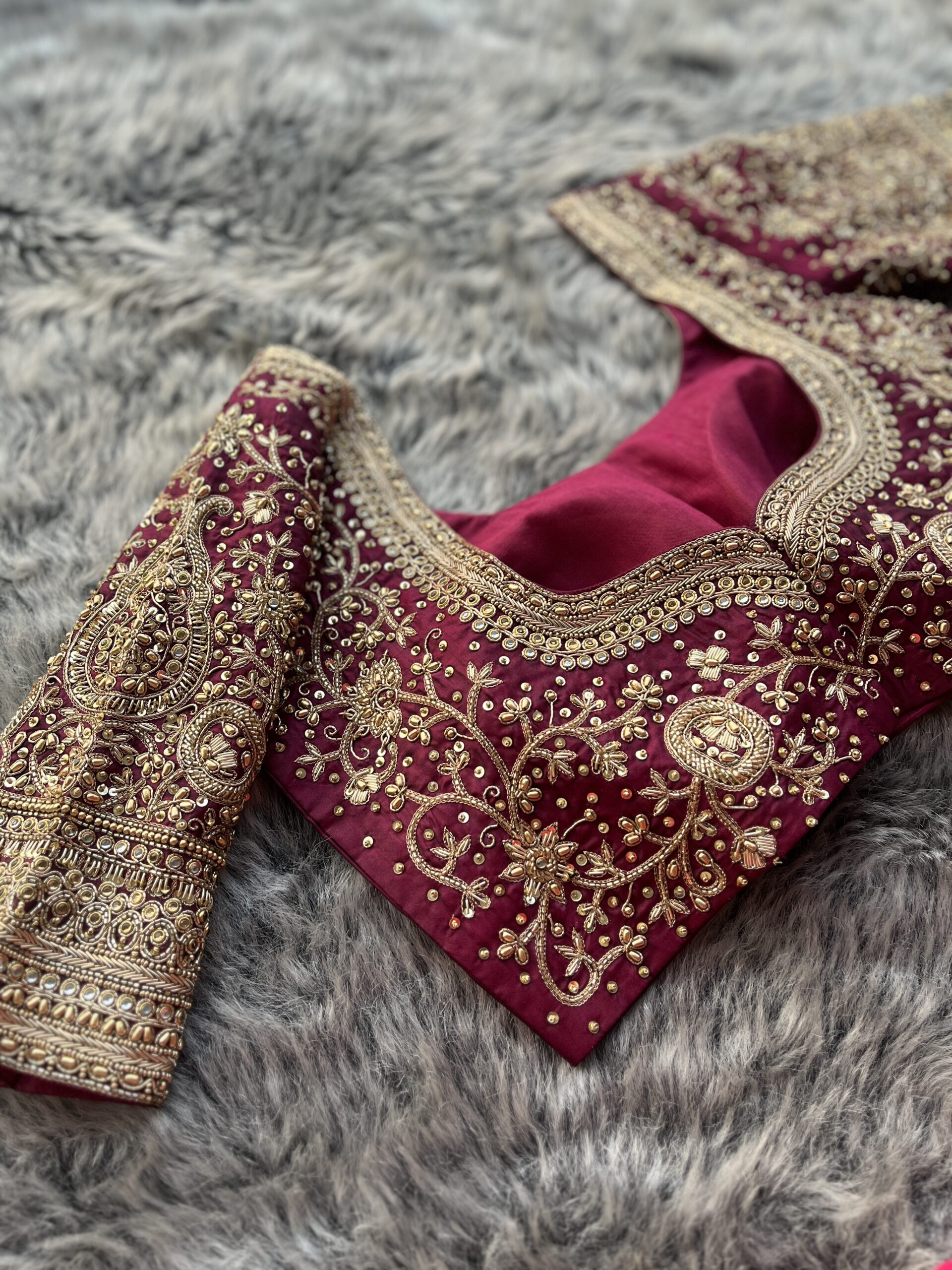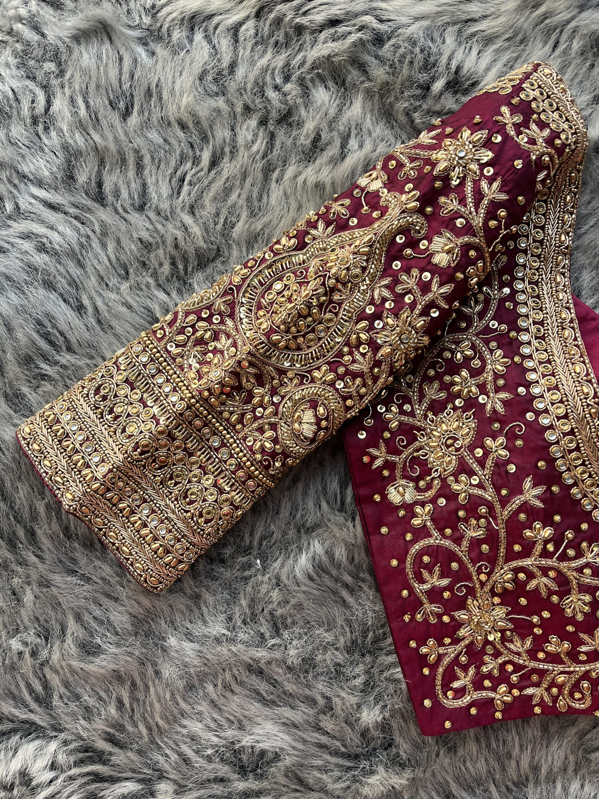 Maroon Bridal Hand Embroidered Zardosi Blouse with Floral Vine Work